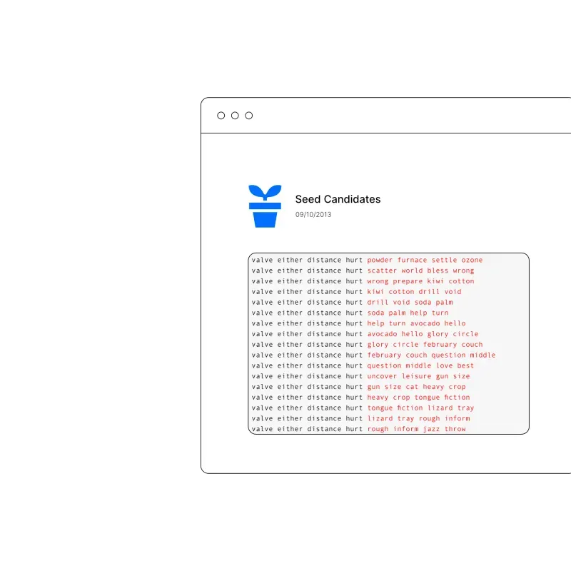 Next, your sensitive seed details will be moved, by hand, to a network of secure air-gapped servers specialized for seed recovery. Using the known pieces of the seed phrase, our team will calculate the potential permutations of seed phrase combinations, building a candidate list typically over 1 billion seeds long.
